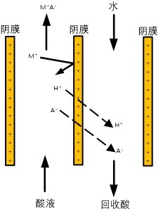 將擴散滲析陰膜、滲析室隔板以及擴散室隔板按一定順序排列起來,在兩側(cè)放置配水板并用夾緊板夾緊的分離酸的設(shè)備。