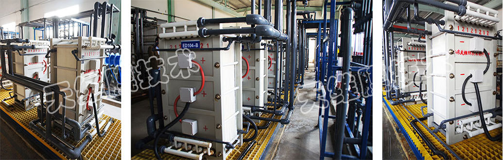 包括三隔室雙極膜電滲析器和二隔室雙極膜電滲析器兩種;三隔室雙極膜電滲析器適用于將無機鹽轉化為對應酸和堿,膜對由雙極膜、陽離子交換膜和陰離子交換膜組成,包含鹽室、酸室和堿室;二隔室雙極膜電滲析器適用于將有機酸鹽轉化為有機酸和堿或將有機堿鹽轉化為有機堿和酸,膜對由雙極膜和陽離子交換膜(包含料室和堿室)或雙極膜和陰離子交換膜(包含料室和酸室)。