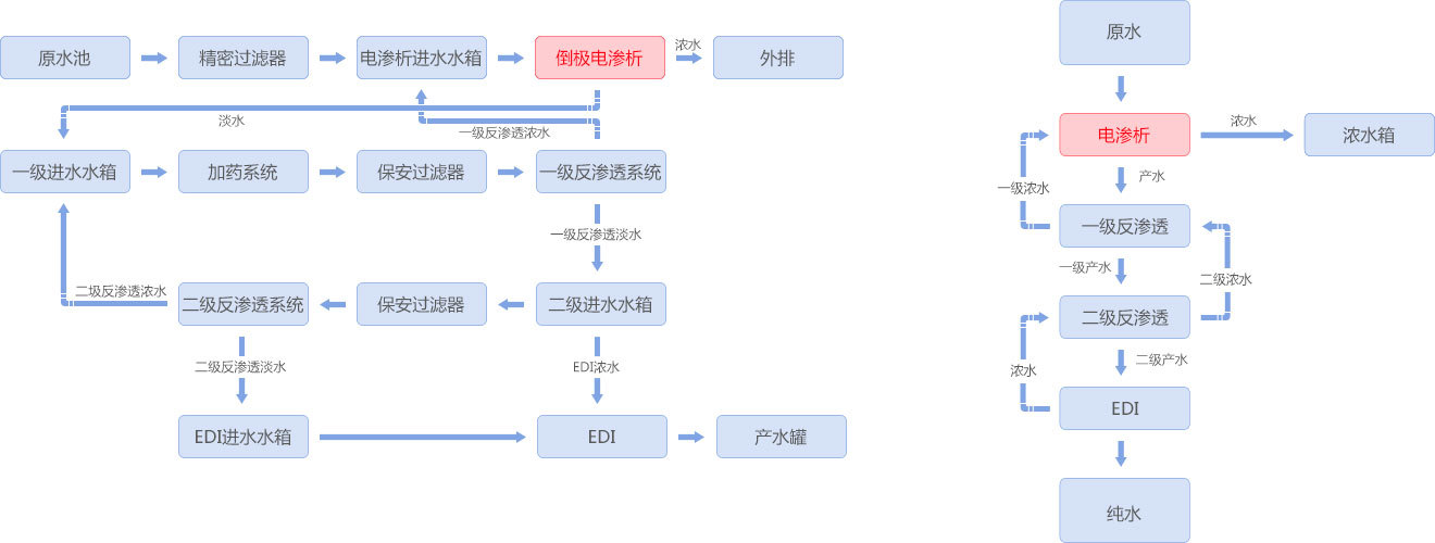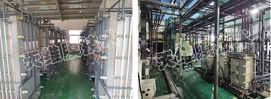 電鍍廢水由于其水質復雜,各類重金屬、COD含量較高,一直是膜濃縮工藝中的難點,采用均相膜電滲析裝置有效的解決了此問題,原水經沉降、氧化、超濾預處理后進入電滲析濃縮, 達到12%后進入MVR蒸發,淡水經反滲透處理后回用,電鍍廢水得到有效處理,達到近零排放。